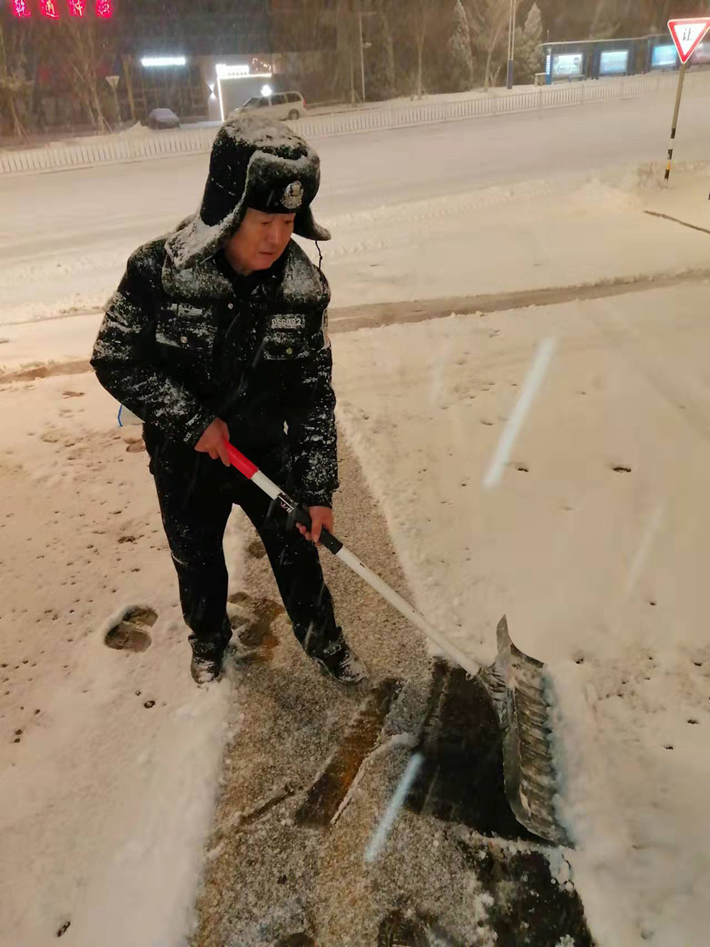 今晨5时起,烟台金盾保安服务有限公司驻各院校、厂企、小区项目保安队员以雪为号、闻令而动,默默无闻地为师生、工人、群众铲除冰雪、保障出行。他们手持工具清扫冰雪,头发、眉毛挂满霜雪,辛勤劳作的画面,成为暴风雪中最美“雪景”。